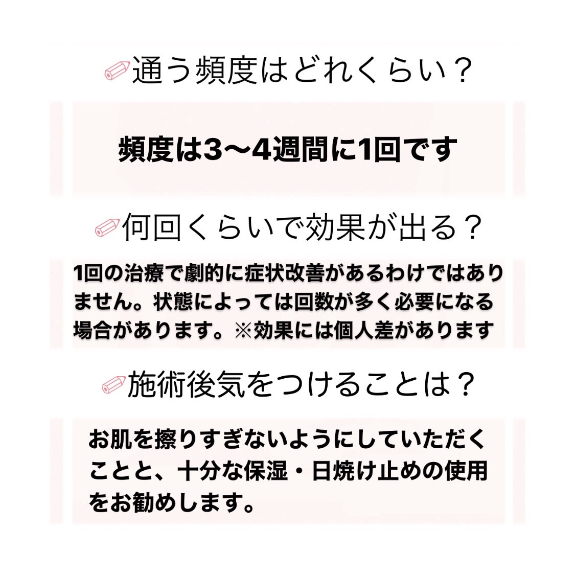 治療後は一時的にお肌が敏感になり、乾燥しやすい状態になったり、日焼けをしやすい状態になるので、十分な保湿と日焼け対策をして頂くようにお願いします( •̀ᴗ•́ )و ̑̑